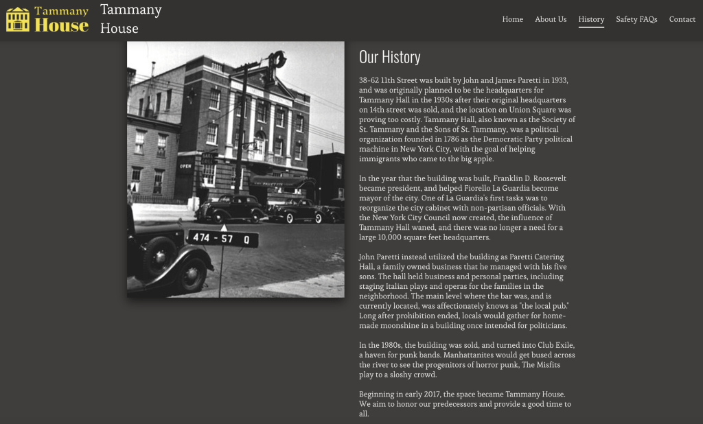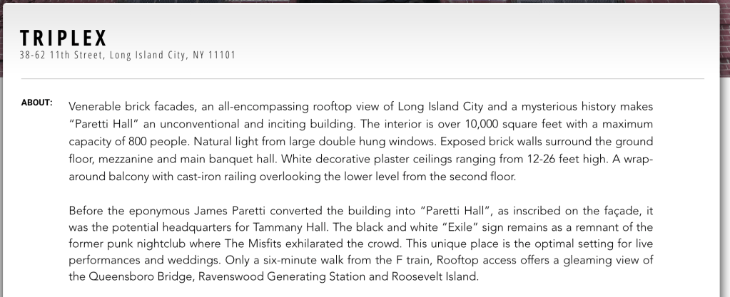 I read the Beautiful and Damned advertisement/flyer website, probably in 2015 (and watched its silent-film styled video), and over the years, when I thought of writing my own, journalistic blog post, I Googled the site again, and found that in 2017, a company called Warehouse LLC, which purchased the site in 2014, began to market the building as an event space called Tammany House. Tammany House posted pictures of one or more events, a photo shoot, a concert, that happened in the then-renovated interior. Another company, Motif Studios, also rented the space as Triplex LIC. Both companies’ websites echoed the rumor that Tammany built Paretti Hall!